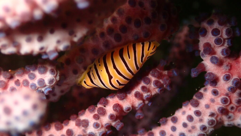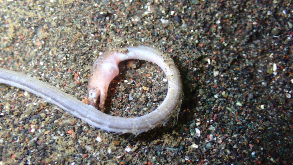 少しだけ砂地出たら亡骸が。ホタテウミヘビの子かな?若干持ち帰りたいくらいパキッとしてて…。